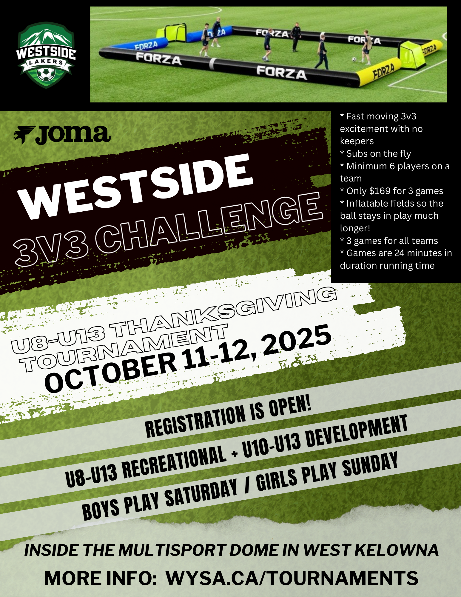WYSA is excited to launch the Holiday 3v3 Cup, presented by JOMA! December 13-14 Ready for a fast moving, and skill focused tournament format? Tired of watching half your team barely touch the ball during games? Well, our exciting 3v3 event is for your team! With four inflatable fields inside the West Kelowna dome, this is sure to be a FAST and EXCITING event with an emphasis on skill development as the ball rarely goes out of play THIS IS AN EVENT FOR SELECT TEAMS ONLY (no rec levels this time) U10-U15 Boys and Girls (2016-2013) * Will play 3v3 (3 players but no goalkeeper) * 24 minute game with running time * $169 registration fee for a team (minimum 5 players required on a roster) - early bird rate is $139 until October 31 using WYSA3v3discount at checkout. TOURNAMENT DETAILS * BOYS play on December 13 * GIRS play on December 14 * All games are 24 minutes running time with subs on the fly * 3 games guaranteed for all teams within a 4 hour block * U10-U12 teams will play 3 games with no scores or standings * U13-U15 teams will play 3 games, plus the top two teams after round robin will play a Cup Final to determine the champion This event will take place in West Kelowna's Multi Sport dome and will be the most exciting fast paced game play during the winter holiday season!