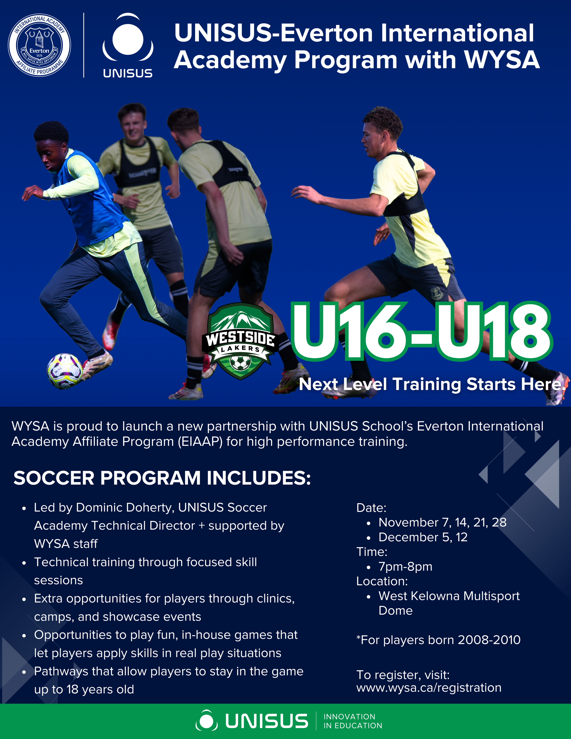 WESTSIDE YOUTH SOCCER is excited to partner with the Unisus School's Everton FC International Academy program for our U4-U7 training program. Starting November 7, and running for 6 Friday night sessions, this program is for players in the 2019-2022 born age groups. At a great introductory rate of $109 which includes a JOMA training shirt, this is an opportunity to train in West Kelowna with a coach who has worked with the Everton FC academy in the UK and around the world. RESUME OF DOMINIC DOHERTY (TECHNICAL DIRECTOR, EVERTON FC ACADEMY PROGRAM @ UNISUS SCHOOL): UEFA B Licence 4 years with the Everton FC International Academy Coached in the Manchester City and Chicago Fire youth programs Lecturer @ Wrexham University (Wales) Coach Educator with the FAW This program takes place at the West Kelowna multisport dome. Register early as space is limited: www.wysa.ca/registration