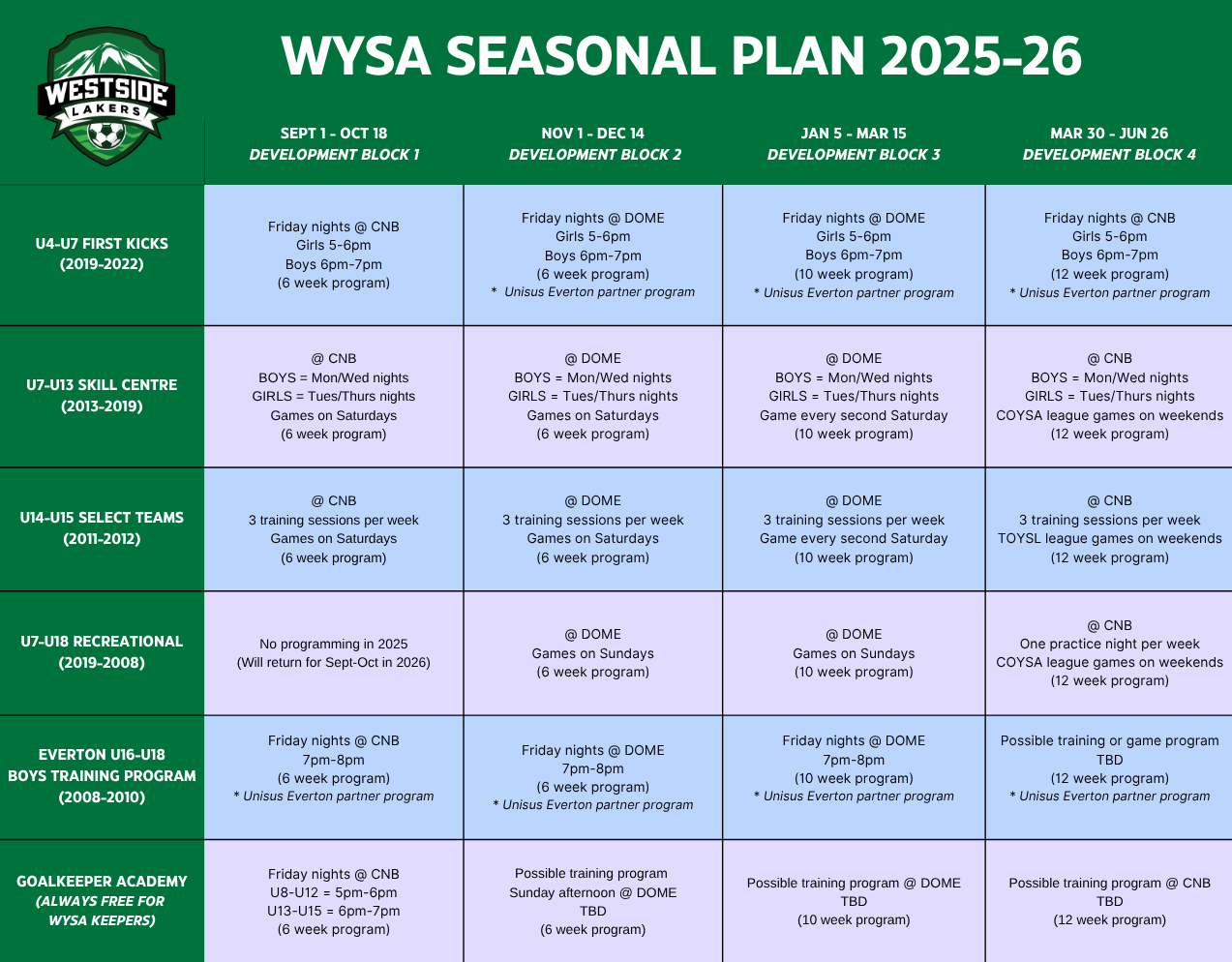 WESTSIDE YOUTH SOCCER is pleased to release an enhanced seasonal plan for the 2025-26 season. This will aid players and parents with understanding the full timelines of play throughout the year!