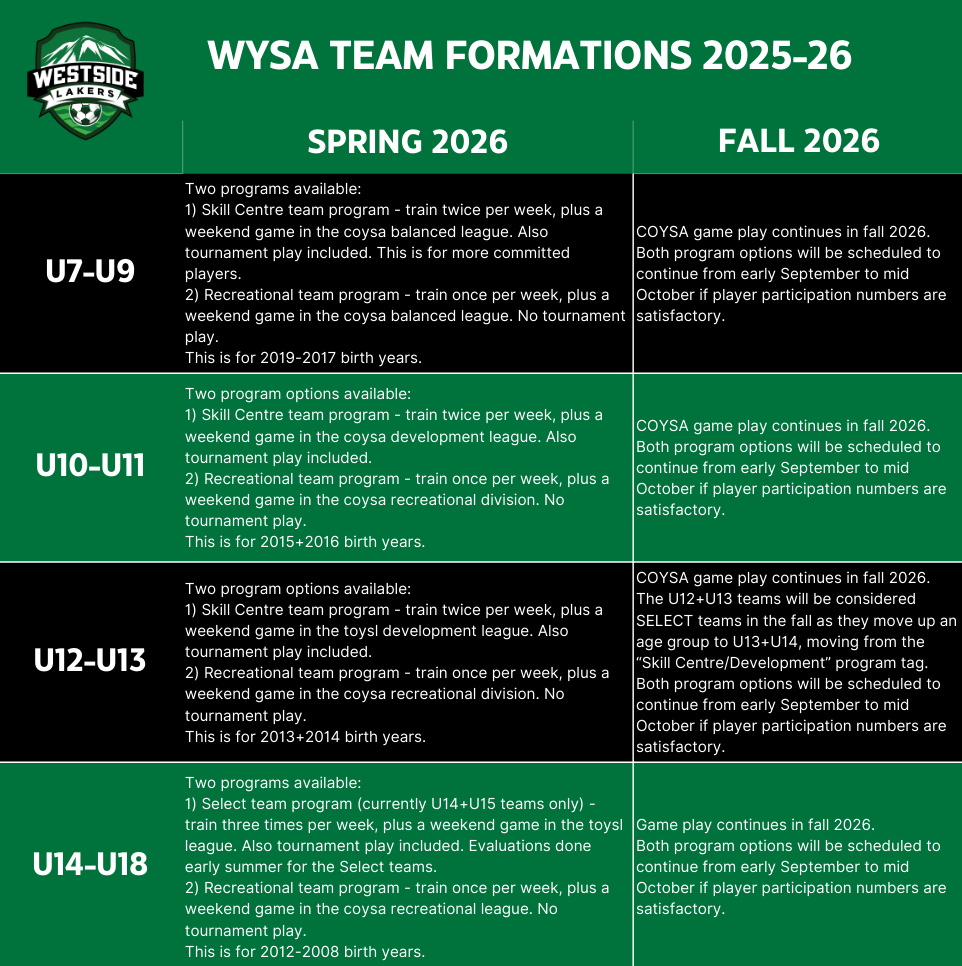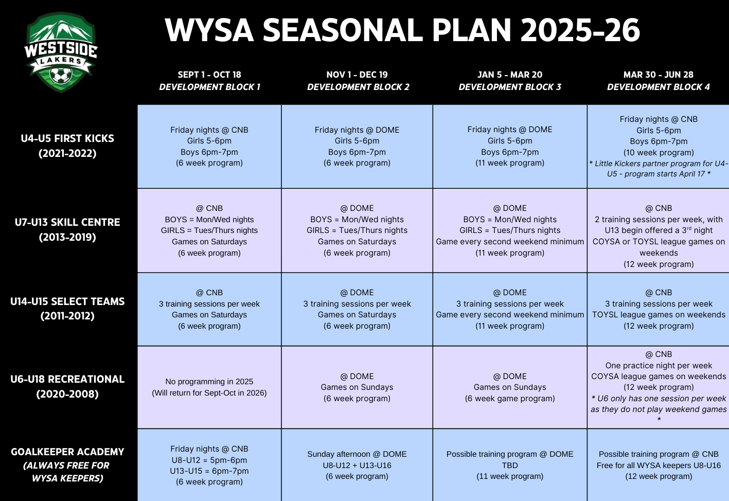 Westside Youth Soccer Association has one underlying mission, and that is to be the top youth development club in the Okanagan. We are pleased to launch revamped year-round programming to take us towards that lofty goal, and that will start with our 2025-26 program. Designed with a strong emphasis on long-term player growth and skill mastery, this new Player Development Program at WYSA is built upon a philosophy that prioritizes individual player progression over short-term team results.