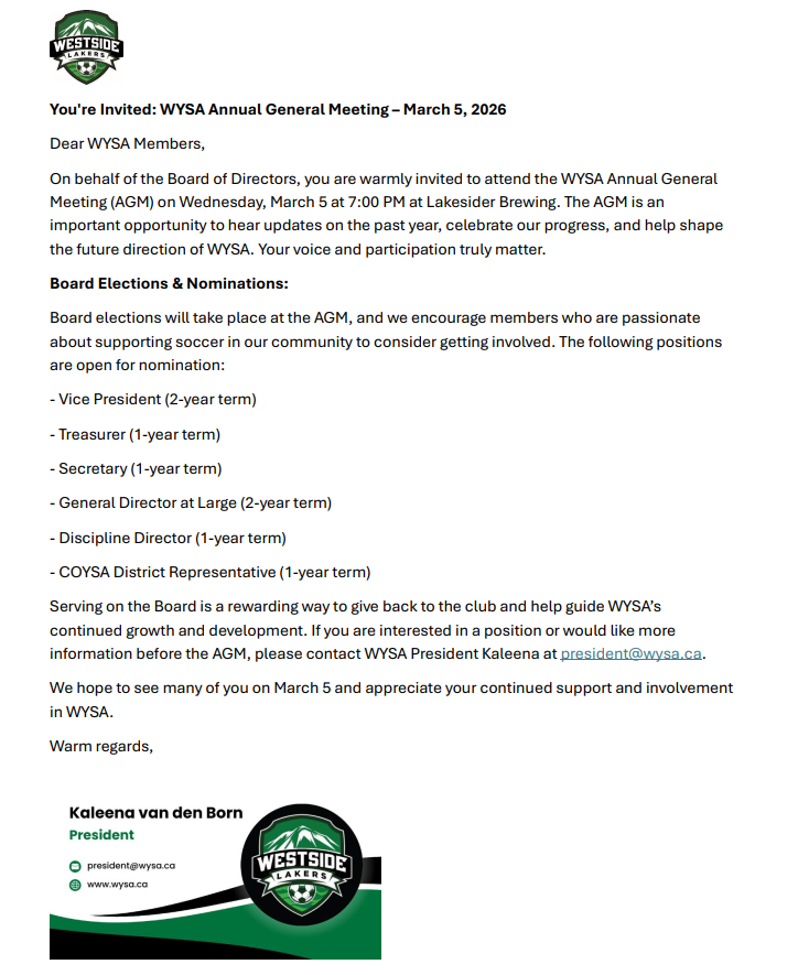 BRIEF HISTORY The WYSA Skill Centre was introduced in 2024 by previous club staff. This program was meant to create a higher level training program that fed into team placements for coysa league play. However, upon reviewing the program and its goals in early 2025, Matt (WYSA ED) and Jason (WYSA TD) determined that the program was too focused on creating teams, with a limited number of players benefiting overall, and didn’t accomplish the club’s goal of total player development. Quite frankly, it was excluding players and narrowing a “team” focus too much. Canada Soccer has a comprehensive Skill Centre structure and a mandate that clubs should follow, and one of the clear guiding principles is that “the underlying aim of Skill Centres is to provide the best environment possible to as many young players as possible for as long as possible.” (from the CSA’s document on Skill Centres across Canada) One of the struggles the club has had over many years was that many players drop out by 14 or 15 years of age, and without a larger base of players that have been developed and included, the club ends up not being able to field teams in the U15 or U16 age groups. This happened again last summer when we had to fold a planned U16 boys team and were required to combine a U14 and U15 girls team due to a lack of numbers overall in those age groups. We strongly felt that without addressing some of these structural issues with the next crop of 7 to 13 year olds in the Skill Centre, and to find a way to increase participation in those key age groups, we were destined to repeat those same issues year over year. WYSA decided the best course of action was that for the fall and winter (2025-26) program there would be no teams created until more players had an opportunity to join and train in an enhanced Skill Centre program. The philosophy was to encourage more players to experience better training over a 6+ month period. We made the adjustment to fully run the fall and winter program with staff coaches so that the training environment could be a monitored environment for all players. Our plan was to put development/select teams together again in the U7-U13 age groups by late winter (Feb/March), and we are on track to do this with the inclusion now of appointed coaches in the Skill Centre age groups. WHERE WE ARE AT We did accomplish the goal of getting more players into a regular training environment. In fact, we saw an increase in the Skill Centre registration in September by 30%. Some groups were bursting at the seems with double the number of players that joined, and some groups added a few more players to supplement the numbers and give more players these developmental opportunities. Yes we had some growing pains with larger groups, but we are now heading into 2026 with a head of steam to put together good development teams for spring play, with coaches that will be supported by our TD and staff coaches. TEAM FORMATION Now that the coaches are being put in place for each U10-U13 development team, those coaches will work with Jason to confirm the players selected for the development teams. Those players will be notified by February 20, and players not selected to a development team will be offered a spot on a recreational team for the spring season. For players NOT currently in the Skill Centre that wish to play on a development team in the spring, they should reach out to Jason ( td@wysa.ca ). Those players will be invited for 2 training sessions before February 20 to be considered for a spot on a spring Development team. For players in the U7-U9 age group, coysa and BC Soccer require clubs to balance those teams and they aren’t considered “select” teams. Jason will work with each of those age groups in lining up coaches and building teams before the end of this current development block. In the spring, U7-U13 Skill Centre teams will practice twice per week with a coysa or toysl game on weekends, whereas there will also be a recreational level at U7-U13 for players looking for less commitment than the Skill Centre program. WYSA will be entering U7-U9 teams in coysa’s regular balanced league, U10-U11 in coysa’s development league, and U12-U13 in the toysl league.