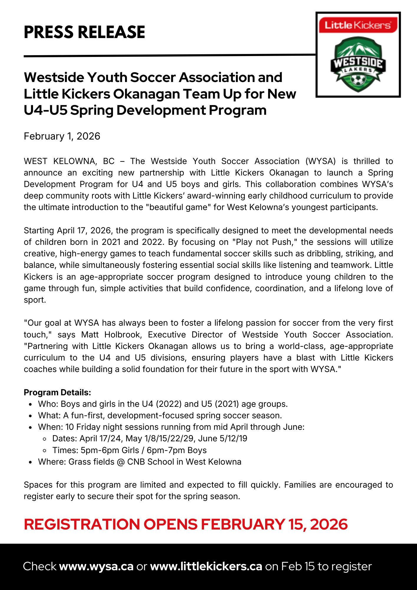 WYSA and Little Kickers Okanagan announce U4-U5 partnership program