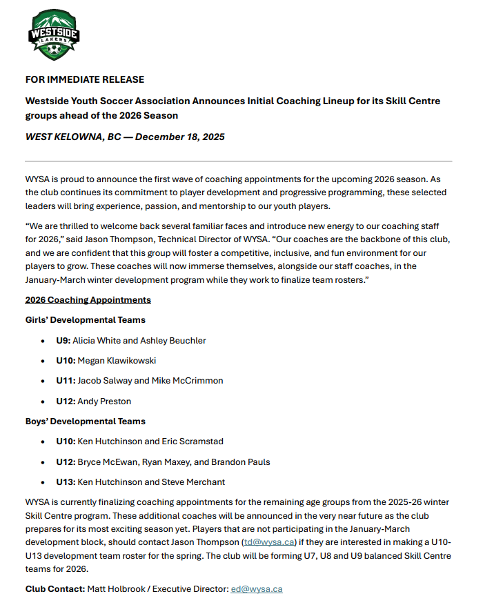 WYSA is excited to launch the Holiday 3v3 Cup, presented by JOMA! December 13-14 Ready for a fast moving, and skill focused tournament format? Tired of watching half your team barely touch the ball during games? Well, our exciting 3v3 event is for your team! With four inflatable fields inside the West Kelowna dome, this is sure to be a FAST and EXCITING event with an emphasis on skill development as the ball rarely goes out of play THIS IS AN EVENT FOR SELECT TEAMS ONLY (no rec levels this time) U10-U15 Boys and Girls (2016-2013) * Will play 3v3 (3 players but no goalkeeper) * 24 minute game with running time * $169 registration fee for a team (minimum 5 players required on a roster) - early bird rate is $139 until October 31 using WYSA3v3discount at checkout. TOURNAMENT DETAILS * BOYS play on December 13 * GIRS play on December 14 * All games are 24 minutes running time with subs on the fly * 3 games guaranteed for all teams within a 4 hour block * U10-U12 teams will play 3 games with no scores or standings * U13-U15 teams will play 3 games, plus the top two teams after round robin will play a Cup Final to determine the champion This event will take place in West Kelowna's Multi Sport dome and will be the most exciting fast paced game play during the winter holiday season!